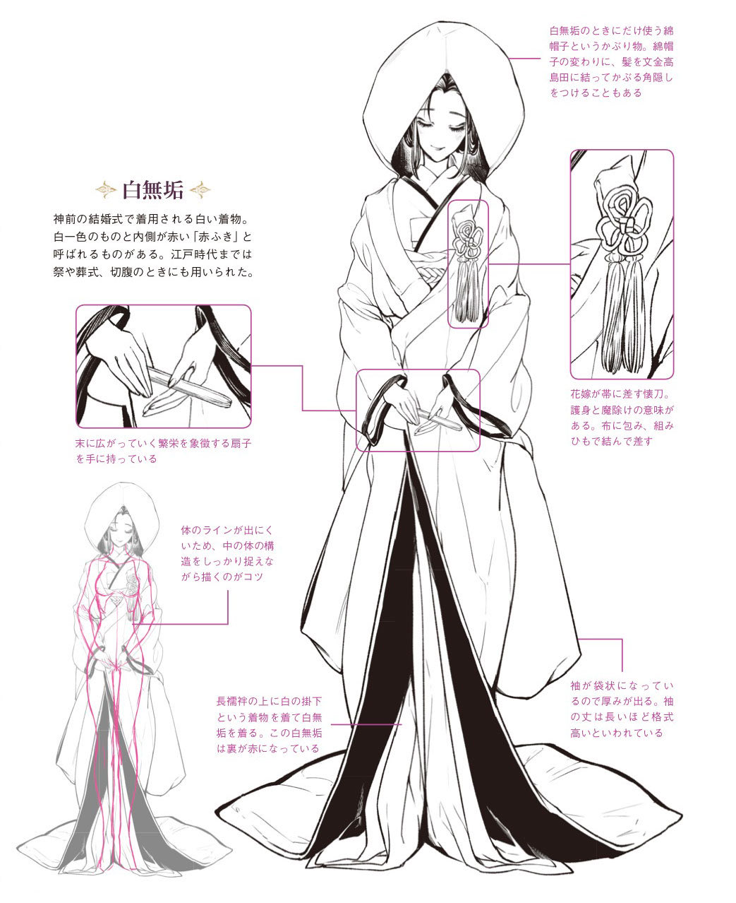 玄光社 超描けるシリーズ 超描ネタ帳 日本の伝統的な着物 白無垢 生地が多くラインが出にくい衣装ですが きちんと体の構造を意識しながら 描くのがコツです Kyachiさん Shirotumechika 著 ドレスの描き方 より T Co Psktwic7eo